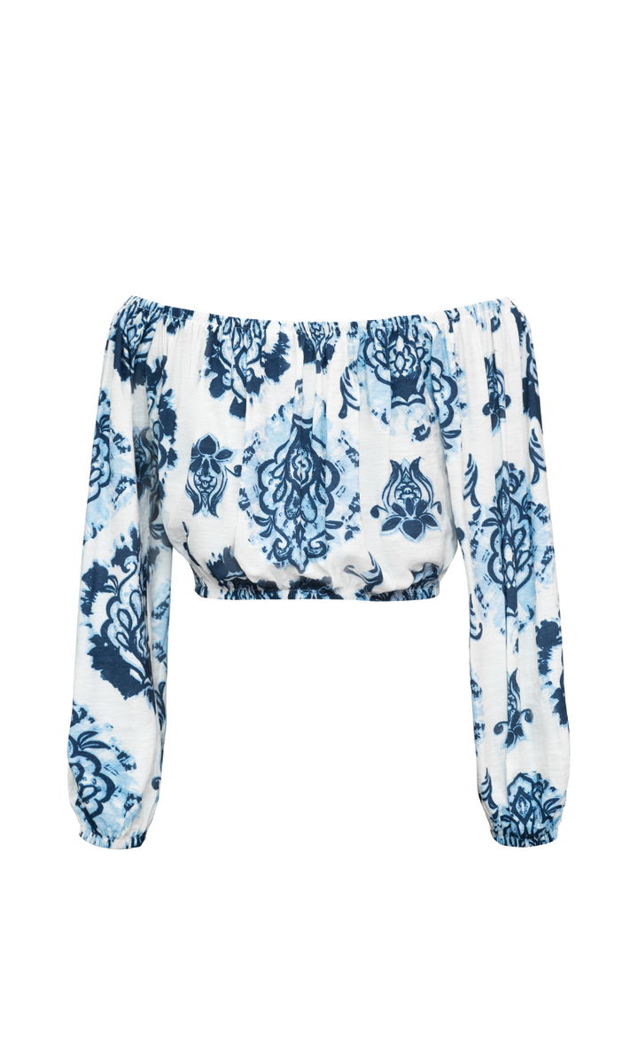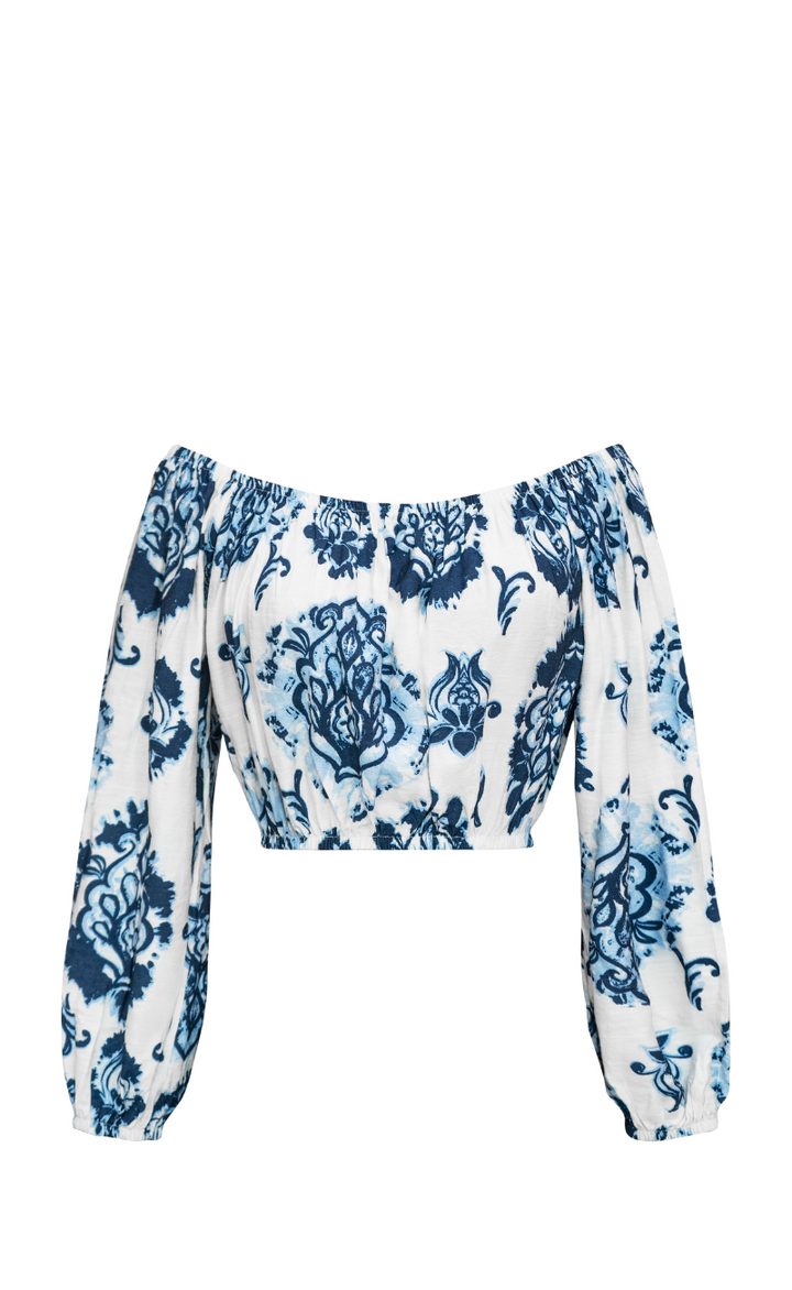 La blusa almada es una prenda de estilo cropped que un volumen inspirado en las olas. La prenda se caracteriza por mangas estilo farol y un amplio escote bandeja, La blusa está elegantemente fruncida en el dobladillo, lo que crea una apariencia ceñida en la cintura.