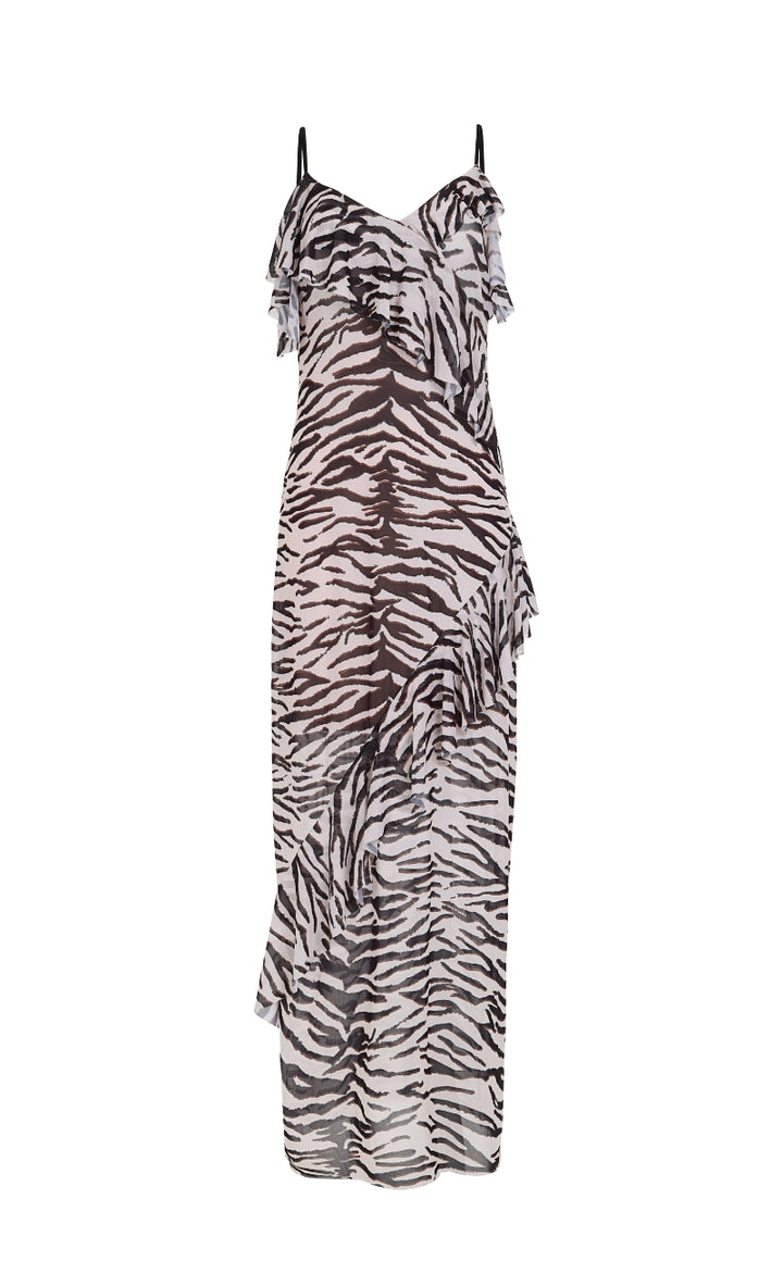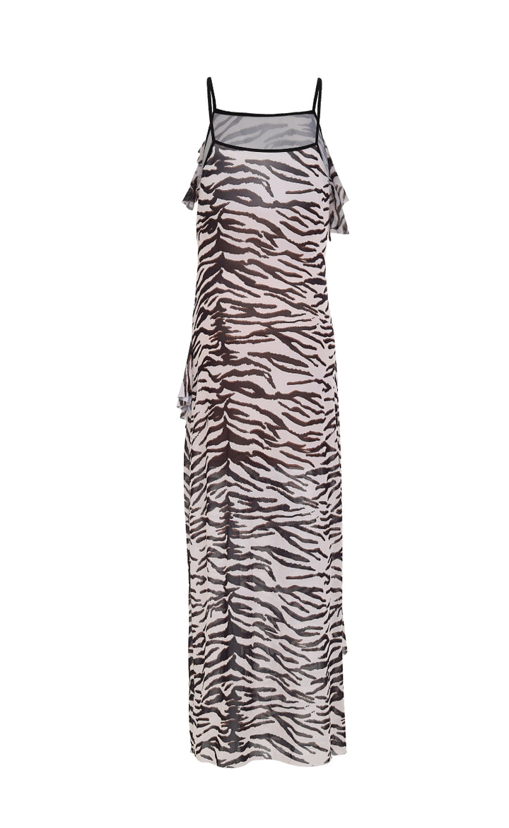 El hermoso vestido violet presenta una elegante silueta maxi sin mangas con un escote en V, elaborado En una suave malla semitransparente estampada con un print atemporal y lleno de versatilidad. Llévalo con sandalias o botas y agrégale un sombrero para darle más protagonismo a tu look.